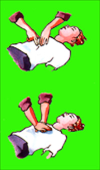 5. Trykk brystkassen ned 4 - 5 cm. pr. kompresjon.Trykk 15. ganger i rekkef�lge, med en hastighet som tilsvarer 80 - 100 ganger i minuttet